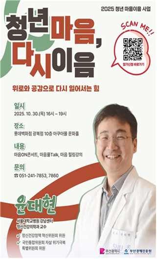 방송 ‘유 퀴즈 온 더 블록’ 등 다양한 매체에서 활발히 활동해온 윤대현 교수는 풍부한 임상 경험을 바탕으로, 청년들이 겪는 마음의 부담을 덜어주는 따뜻한 이야기를 전할 예정입니다.